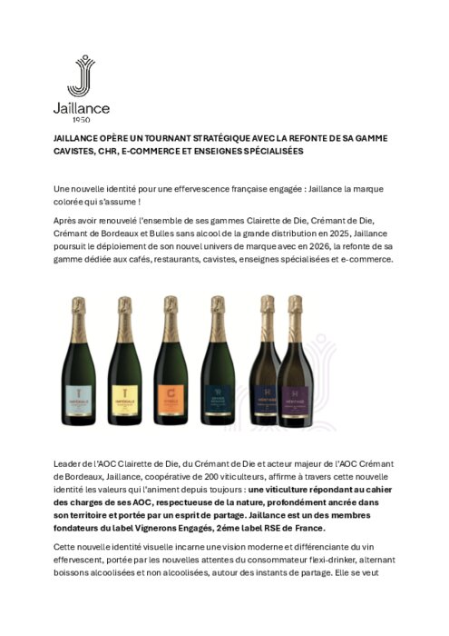 Après avoir renouvelé l’ensemble de ses gammes Clairette de Die, Crémant de Die, Crémant de Bordeaux et Bulles sans alcool de la grande distribution en 2025, Jaillance poursuit le déploiement de son nouvel univers de marque avec en 2026, la refonte de sa gamme dédiée aux cafés, restaurants, cavistes, enseignes spécialisées et e-commerce.