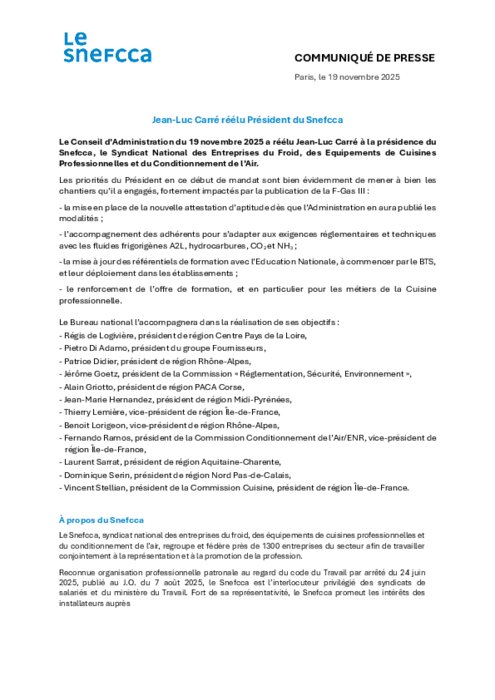 Les priorités du président en ce début de mandat consistent naturellement à mener à bien les chantiers qu’il a engagés, lesquels sont fortement impactés par la publication de la F-Gas III. Il s’agit notamment de mettre en place la nouvelle attestation d’aptitude dès que l’Administration en aura publié les modalités, d’accompagner les adhérents dans leur adaptation aux exigences réglementaires et techniques liées aux fluides frigorigènes A2L, aux hydrocarbures, au CO₂ et au NH₃, de mettre à jour les référentiels de formation avec l’Éducation nationale, en commençant par le BTS, puis de les déployer dans les établissements, ainsi que de renforcer l’offre de formation, en particulier pour les métiers de la cuisine professionnelle.