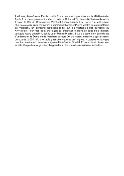 À 47 ans, Jean-Pascal Picollet quitte Èze et sa vue imprenable sur la Méditerranée. Après 11 années passées à la direction de La Chèvre d’Or, Relais & Château 5 étoiles, il prend la tête du Domaine de Verchant à Castelnau-le-Lez, dans l’Hérault.