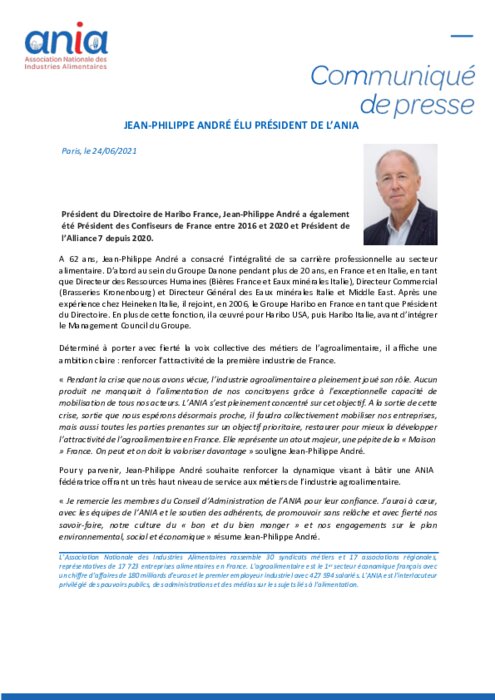 Jean-Philippe André a été élu ce jour, par le Conseil d’Administration de l’Association Nationale des Industries Alimentaires, Président de l’ANIA pour un mandat de 3 ans. Il succède à Richard Girardot, qui occupait cette fonction depuis 2018 et dont l’implication durant la crise a été saluée.
