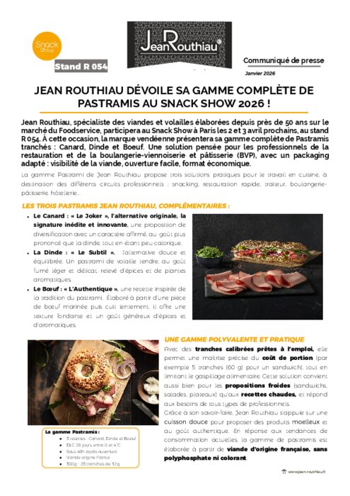Jean Routhiau, spécialiste des viandes et volailles élaborées depuis près de 50 ans sur le marché du foodservice, participera au Snack Show à Paris les 2 et 3 avril prochains, au stand R 054. À cette occasion, la marque vendéenne présentera sa gamme complète de Pastramis tranchés : Canard, Dinde et Boeuf. Une solution pensée pour les professionnels de la restauration et de la boulangerie-viennoiserie et pâtisserie (BVP), avec un packaging adapté : visibilité de la viande, ouverture facile, format économique.