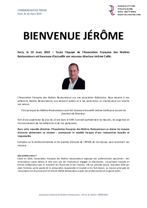 Métiers 10 mars 2022 - 11:57 Toute l’équipe de l’Association Française des Maîtres Restaurateurs est heureuse d’accueillir son nouveau directeur Jérôme Caillé. PDF (214 Ko) Télécharger