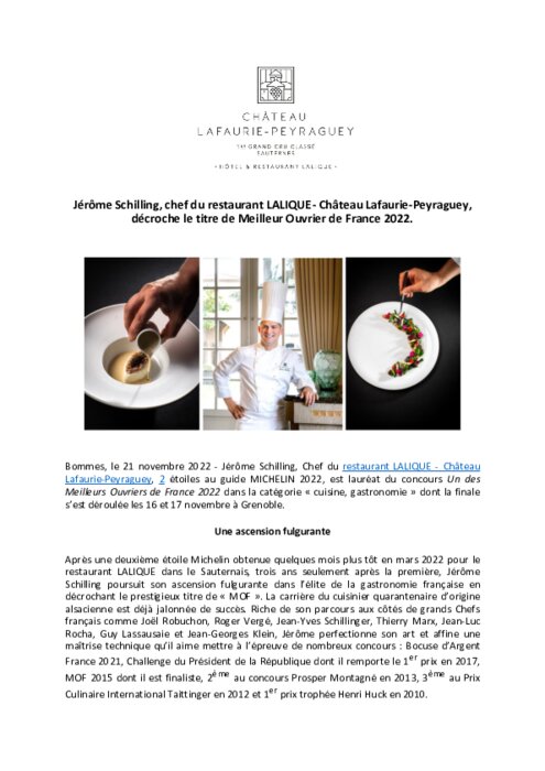 Après une deuxième étoile Michelin obtenue quelques mois plus tôt en mars 2022 pour le restaurant LALIQUE dans le Sauternais, trois ans seulement après la première, Jérôme Schilling poursuit son ascension fulgurante dans l’élite de la gastronomie française en décrochant le prestigieux titre de « MOF ».