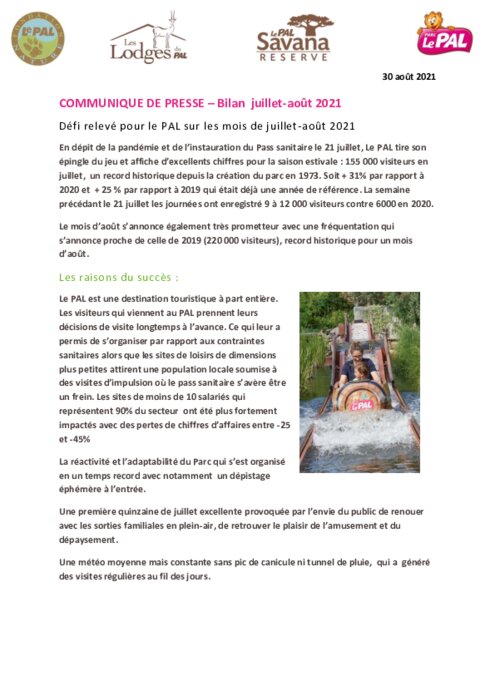 Alain GRISET, Ministre des PME et Jean-Baptiste Lemoyne Secrétaire d'État chargé du Tourisme visiteront Le PAL, acteur majeur du département. Une réunion organisée par le Conseil départemental de l'Allier se tiendra sur place en présence de la plupart des sites touristiques Bourbonnais sur le thème du tourisme en ruralité.