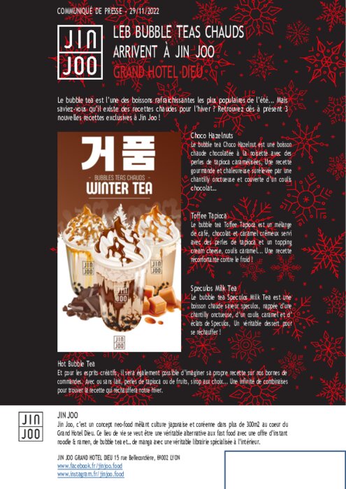 Fournisseurs 29 novembre 2022 - 17:04 'Winter Tea', avec 3 recettes exclusives Choco Hazelnut, Toffee Tapioca & Speculos Milk Tea, ainsi que la possibilité de créer son propre Bubble Tea chaud avec de nombreuses options. PDF (2 Mo) Télécharger