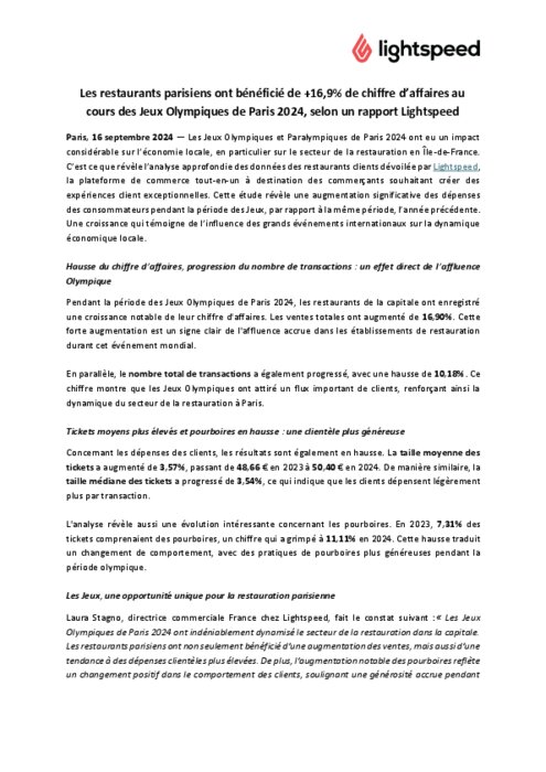 Les Jeux Olympiques et Paralympiques de Paris 2024 ont eu un impact considérable sur l’économie locale, en particulier sur le secteur de la restauration en Île-de-France. C’est ce que révèle l’analyse approfondie des données des restaurants clients dévoilée par Lightspeed, la plateforme de commerce tout-en-un à destination des commerçants souhaitant créer des expériences client exceptionnelles. Cette étude révèle une augmentation significative des dépenses des consommateurs pendant la période des Jeux, par rapport à la même période, l’année précédente. Une croissance qui témoigne de l’influence des grands événements internationaux sur la dynamique économique locale.