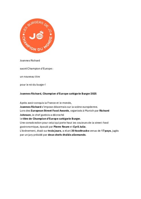 Après avoir conquis la France et le monde, Joannes Richard s’impose désormais sur la scène européenne. Lors des European Street Food Awards, organisés à Munich par Richard Johnson, le chef gardois a décroché le titre de Champion d’Europe catégorie Burger. Une consécration pour celui qui porte haut les couleurs de la street-food gastronomique, épaulé par Pierre Reure et Cyril Julia. L’événement, étalé sur trois jours, a réuni 30 foodtrucks venus de 17 pays, jugés par un jury présidé par deux chefs étoilés allemands.