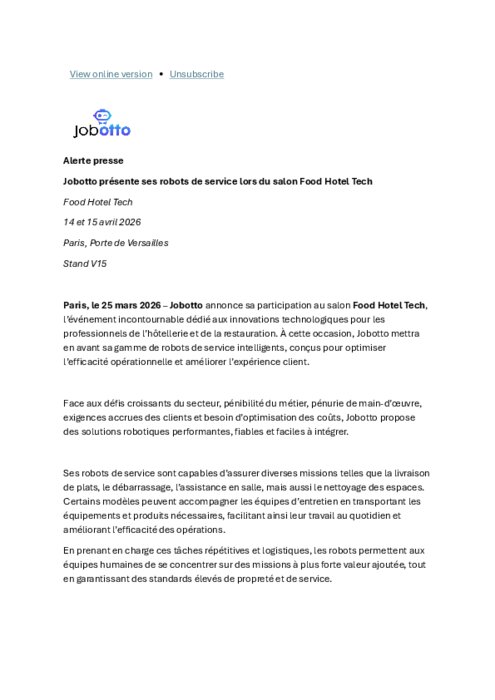 Jobotto annonce sa participation au salon Food Hotel Tech, l’événement incontournable dédié aux innovations technologiques pour les professionnels de l’hôtellerie et de la restauration. À cette occasion, Jobotto mettra en avant sa gamme de robots de service intelligents, conçus pour optimiser l’efficacité opérationnelle et améliorer l’expérience client.