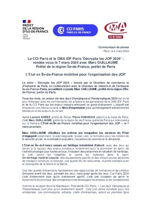 Tous les mois, un acteur clé des Jeux Olympiques et Paralympiques 2024 est invité pour échanger avec les commerçants, les artisans et les partenaires de la CMA IDF-Paris et de la CCI Paris sur les enjeux majeurs entourant ce grand événement. L’objectif est d'instaurer une tribune ouverte et libre d’expression pour qu’interagissent activement les décideurs et les acteurs du terrain
