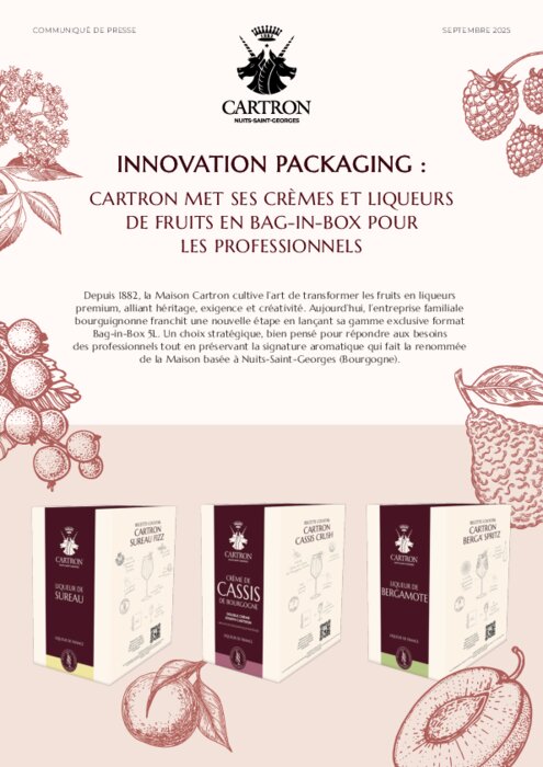 Depuis 1882, la Maison Cartron cultive l’art de transformer les fruits en liqueurs premium, alliant héritage, exigence et créativité. Aujourd’hui, l’entreprise familiale bourguignonne franchit une nouvelle étape en lançant sa gamme exclusive format Bag-in-Box 5L. Un choix stratégique, bien pensé pour répondre aux besoins des professionnels tout en préservant la signature aromatique qui fait la renommée de la Maison basée à Nuits-Saint-Georges (Bourgogne).