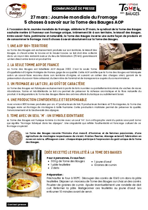 Métiers 27 février 2026 - 08:46 À l’occasion de la Journée Mondiale du Fromage le 27 mars, le Syndicat de la Tome des Bauges souhaite mettre à l’honneur son fromage emblématique du Massif des Bauges. PDF (1 Mo) Télécharger Photo de Engin Akyurt: https://www.pexels.com/fr-fr/photo/nourriture-a-bord-brun-2531189/