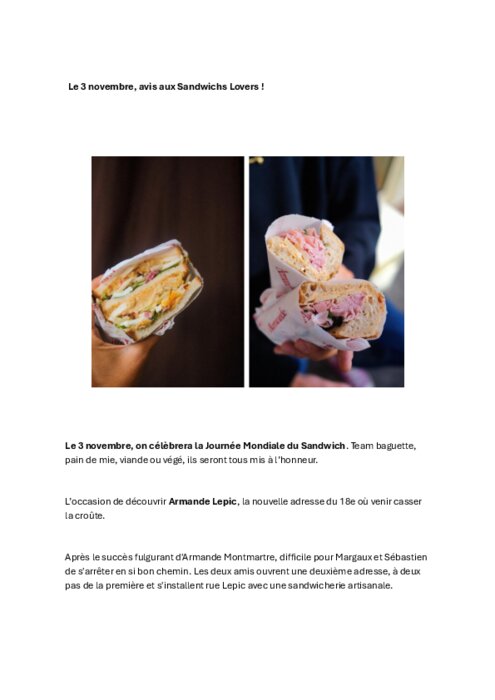 Le 3 novembre, on célèbrera la Journée Mondiale du Sandwich. Team baguette, pain de mie, viande ou végé, ils seront tous mis à l’honneur. L’occasion de découvrir Armande Lepic, la nouvelle adresse du 18e où venir casser la croûte. Après le succès fulgurant d'Armande Montmartre, difficile pour Margaux et Sébastien de s'arrêter en si bon chemin. Les deux amis ouvrent une deuxième adresse, à deux pas de la première et s'installent rue Lepic avec une sandwicherie artisanale.