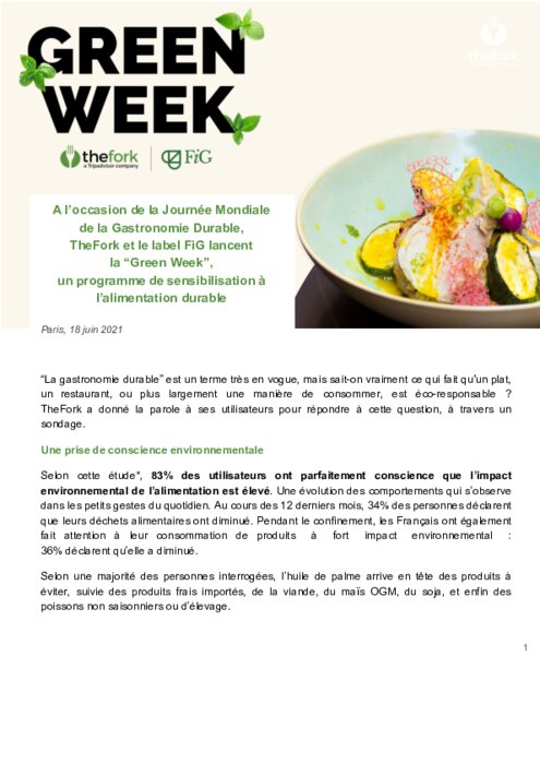 A l’occasion de la Journée mondiale de la Gastronomie Durable, ce vendredi 18 juin, TheFork s’associe à FiG (Food Index for Good), et lance la “Green Week” : un programme d'activités dédié à la sensibilisation des Français sur la question de l’alimentation durable.
