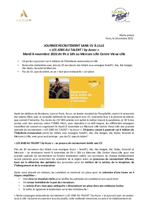 Journée recrutement sans CV à Lille "Les jobs au talent ! by Accor"