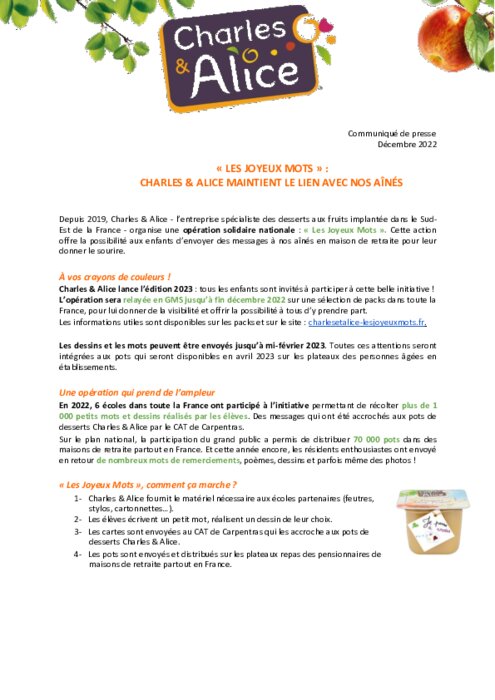 Fournisseurs 05 décembre 2022 - 14:37 Tous les enfants sont invités à participer pour rédiger des messages qui seront insérés sur les packs des desserts aux fruits de nos aînés en maison de retraite. PDF (244 Ko) Télécharger