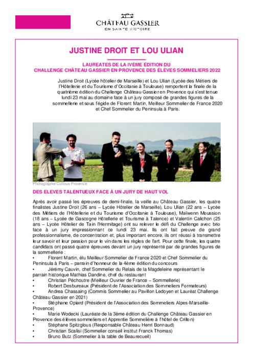 Justine Droit (Lycée hôtelier de Marseille) et Lou Ulian (Lycée des Métiers de l’Hôtellerie et du Tourisme d’Occitanie à Toulouse) remportent la finale de la quatrième édition du Challenge Château Gassier en Provence qui s’est tenue lundi 23 mai au domaine face à un jury composé de grandes figures de la sommellerie et sous l’égide de Florent Martin, Meilleur Sommelier de France 2020 et Chef Sommelier du Peninsula à Paris.