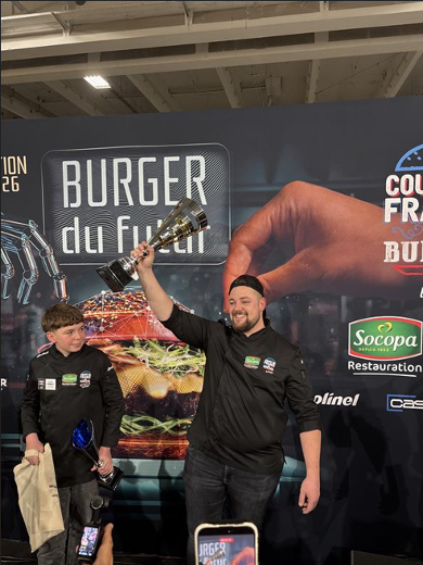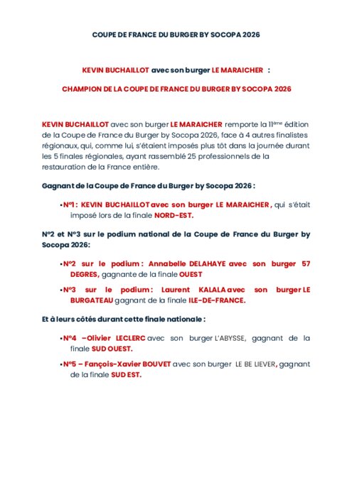 Kevin Buchaillot, avec son burger Le Maraîcher, remporte la 11ème édition de la Coupe de France du Burger by Socopa 2026, face à 4 autres finalistes régionaux, qui, comme lui, s’étaient imposés plus tôt dans la journée durant les 5 finales régionales, ayant rassemblé 25 professionnels de la restauration de la France entière.