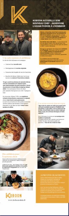 Koboon, la franchise street-food reconnue pour son exigence et sa créativité, annonce l’arrivée de Akhisoum (Alexandre de son vrai prénom) à la tête de ses cuisines. Chef au parcours unique, d’origine laotienne et thaïlandaise, il s’apprête à insuffler un vent de modernité, de fraîcheur et d’Asian Fusion dans l’univers Koboon.