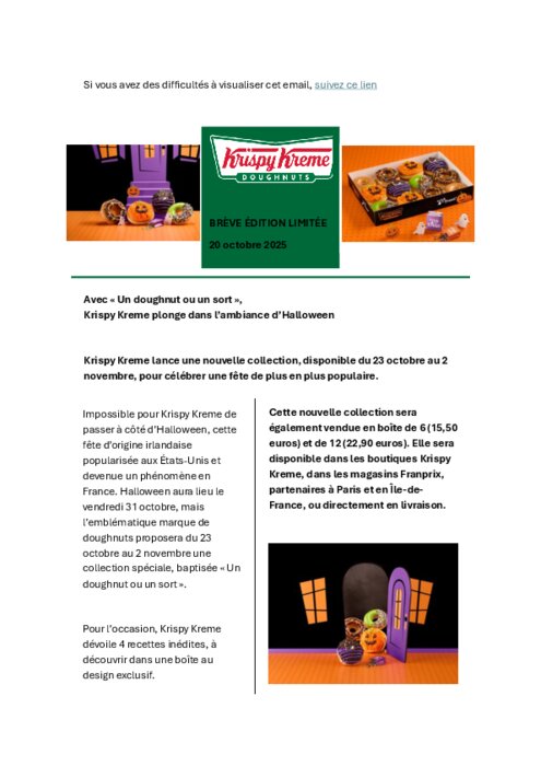 Impossible pour Krispy Kreme de passer à côté d’Halloween, cette fête d’origine irlandaise popularisée aux États-Unis et devenue un phénomène en France. Halloween aura lieu le vendredi 31 octobre, mais l’emblématique marque de doughnuts proposera du 23 octobre au 2 novembre une collection spéciale, baptisée « Un doughnut ou un sort ».