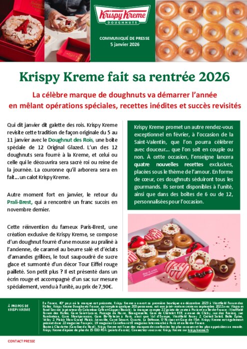 Qui dit janvier dit galette des rois. Krispy Kreme revisite cette tradition de façon originale du 5 au 11 janvier avec le Doughnut des Rois, une boîte spéciale de 12 Original Glazed. L’un des 12 doughnuts sera fourré à la Kreme, et celui ou celle qui le découvrira sera sacré roi ou reine de la journée. La couronne qu’il arborera sera en fait… un calot Krispy Kreme.