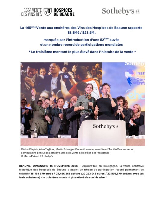 La vente caritative historique des Hospices de Beaune a atteint un niveau de participation record permettant de totaliser 18 754 670 euros / 21,496,368 dollars (20 223 043 euros / 23,509,670 dollars avec les frais acheteurs) – le troisième montant plus élevé de son histoire.