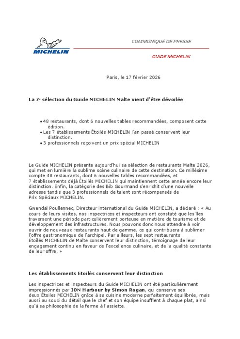Le Guide Michelin présente sa sélection de restaurants Malte 2026, qui met en lumière la sublime scène culinaire de cette destination. Ce millésime compte 48 restaurants, dont 6 nouvelles tables recommandées, et 7 établissements déjà Étoilés Michelin qui maintiennent cette année encore leur distinction. Enfin, la catégorie des Bib Gourmand s'enrichit d'une nouvelle adresse tandis que 3 professionnels de talent sont récompensés de Prix Spéciaux Michelin.