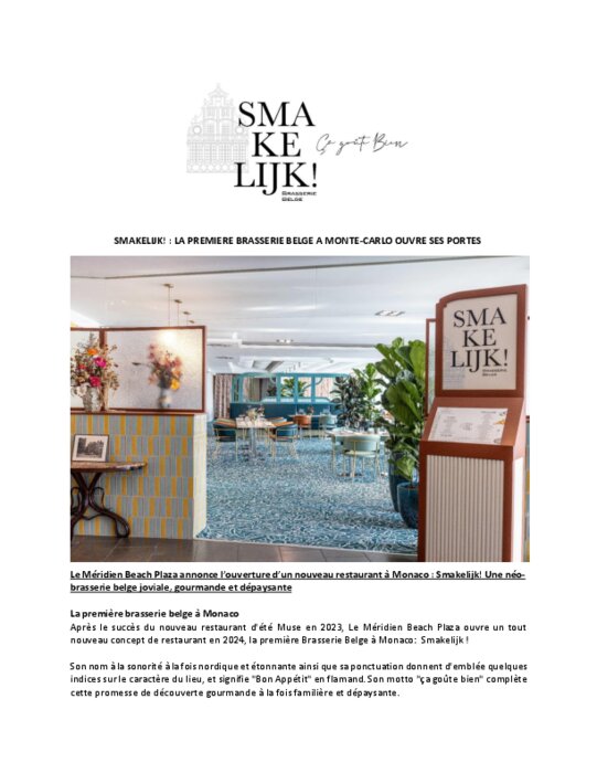 Après le succès du nouveau restaurant d'été Muse en 2023, Le Méridien Beach Plaza ouvre un tout nouveau concept de restaurant en 2024, la première Brasserie Belge à Monaco: Smakelijk ! Son nom à la sonorité à la fois nordique et étonnante ainsi que sa ponctuation donnent d'emblée quelques indices sur le caractère du lieu, et signifie "Bon Appétit" en flamand. Son motto "ça goûte bien" complète cette promesse de découverte gourmande à la fois familière et dépaysante.