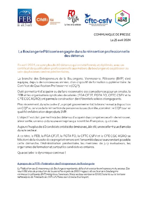Métiers 25 avril 2024 - 11:13 En avril 2024, ce sont plus de 60 détenus qui ont été formés et diplômés aux métiers de boulanger et de pâtissier , avec un certificat de qualification professionnelle, au sein de plusieurs centres pénitentiaires. PDF (506 Ko) Télécharger