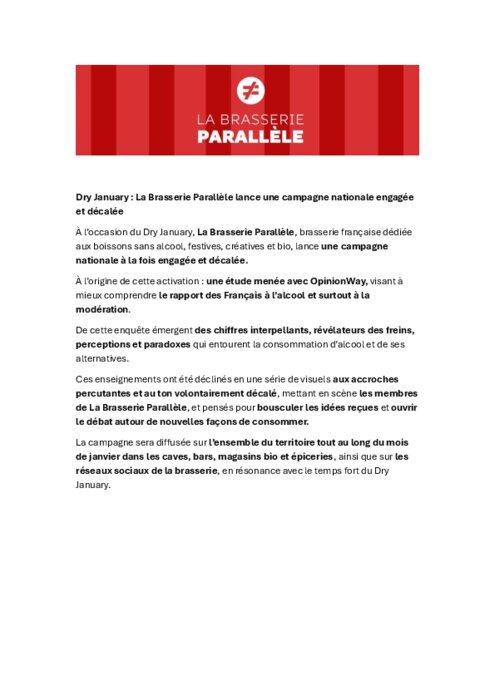 Après avoir mené, en collaboration avec OpinionWay, une étude sur le rapport des Français à l’alcool et à la modération, la Brasserie Parallèle, spécialisée dans le sans-alcool, décline ses résultats dans une campagne de communication nationale engagée et décalée à l’occasion du Dry January.