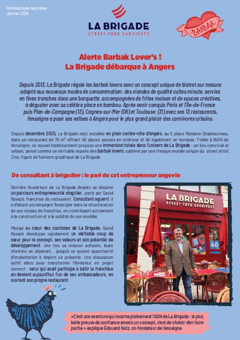 Plongé au cœur des coulisses de La Brigade, David Ravazé développe rapidement un véritable coup de cœur pour le concept, ses valeurs et son potentiel de développement. Une fois sa mission achevée, leurs chemins se séparent… jusqu’à ce qu’une opportunité d’implantation à Angers se présente. Une discussion suffit alors pour transformer l’évidence en projet concret : celui qui avait participé à bâtir la franchise en devient aujourd’hui l’un de ses ambassadeurs, en ouvrant son propre restaurant.