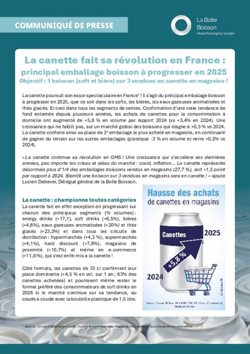 La canette poursuit son essor spectaculaire en France ! Il s’agit du principal emballage boisson à progresser en 2025, que ce soit dans les softs, les bières, les eaux gazeuses aromatisées et thés glacés. Et ceci dans tous les segments de ventes. Confirmation d’une vraie tendance de fond entamée depuis plusieurs années, les achats de canettes pour la consommation à domicile ont augmenté de +5,8 % en volume par rapport 2024 (vs +3,4% en 2024). Une croissance qui ne faiblit pas, sur un marché global des boissons qui stagne à +0,3 % vs 2024. La canette conforte ainsi sa place de 2e emballage le plus acheté en magasins, en continuant de gagner du terrain sur les autres emballages (plastique -3 % en volume et verre +0,2% vs 2024).