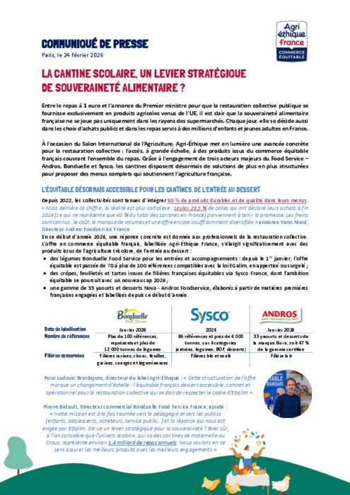 Entre le repas à 1 euro et l'annonce du Premier ministre pour que la restauration collective publique se fournisse exclusivement en produits agricoles venus de l’UE, il est clair que la souveraineté alimentaire française ne se joue pas uniquement dans les rayons des supermarchés. Chaque jour, elle se décide aussi dans les choix d’achats publics et dans les repas servis à des millions d'enfants et jeunes adultes en France.