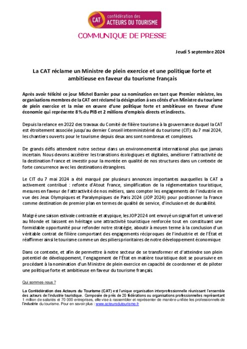 Après avoir félicité ce jour Michel Barnier pour sa nomination en tant que Premier ministre, les organisations membres de la CAT ont réclamé la désignation à ses côtés d’un Ministre du tourisme de plein exercice et la mise en œuvre d’une politique forte et ambitieuse en faveur d’une économie qui représente 8 % du PIB et 2 millions d’emplois directs et indirects.