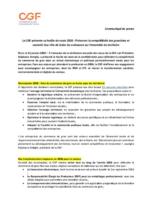 A l’occasion de la cérémonie annuelle des vœux de la CGF, son Président, Stéphane Antiglio, a présenté la feuille de route de la confédération pour défendre la compétitivité du commerce de gros dans un climat économique et politique particulièrement tendu pour les entreprises. Face aux enjeux qui attendent la profession en 2026, la CGF réaffirme son engagement pour accompagner les entreprises, dont les PME et ETI, et réussir la transformation sociétale, environnementale et digitale du secteur.