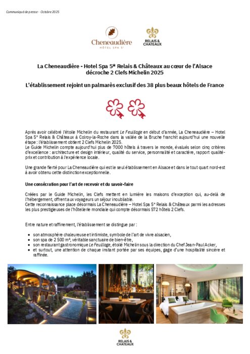 Après avoir célébré l’étoile Michelin du restaurant Le Feuillage en début d’année, La Cheneaudière – Hotel Spa 5* Relais et Châteaux à Colroy-la-Roche dans la vallée de la Bruche franchit aujourd’hui une nouvelle étape : l’établissement obtient 2 Clefs Michelin 2025. Le Guide Michelin compte aujourd'hui plus de 7000 hôtels à travers le monde, évalués selon cinq critères d’excellence : architecture et design intérieur, qualité du service, personnalité et caractère, rapport qualité-prix et contribution à l'expérience locale.