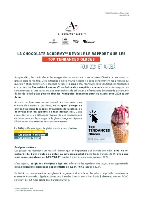 Au quotidien, les habitudes et les usages des consommateurs ne cessent d’évoluer et ne sont pas gravés dans le marbre. Cela influence ainsi la manière dont les gens consomment les produits du quotidien et par extension, le sujet de l’étude : la glace. Pour connaître les évolutions, les tendances et attentes, la Chocolate Academy a réalisé des enquêtes exclusives menées auprès des consommateurs, une vaste analyse du marché et de précieuses informations émanant de partenaires de données stratégiques pour en tirer les Principales Tendances pour les glaces pour 2024 et au- delà.