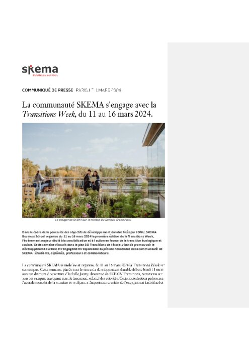 Dans le cadre de la poursuite des objectifs de développement durable fixés par l'ONU, SKEMA Business School organise du 11 au 16 mars la première édition de la Transitions Week, l'événement majeur dédié à la sensibilisation et à l'action en faveur de la transition écologique et sociale. Cette semaine s'inscrit dans le plan 3D Transitions de l'école, visant à promouvoir le développement durable et l'engagement responsable auprès de l'ensemble de la communauté de SKEMA : étudiants, diplômés, professeurs et collaborateurs.