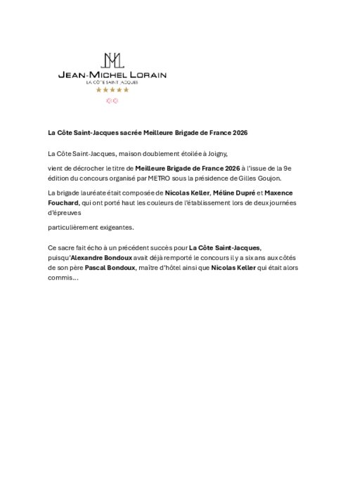 Métiers 22 avril 2026 - 09:09 La Côte Saint-Jacques, maison doublement étoilée à Joigny, vient de décrocher le titre de Meilleure Brigade de France 2026 à l’issue de la 9e édition du concours organisé par Metro sous la présidence de Gilles Goujon. PDF (1 Mo) Télécharger credit Metro