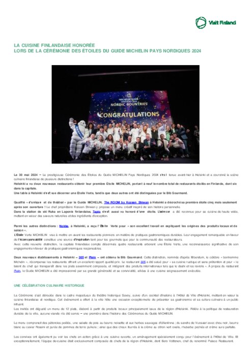 La cuisine finlandaise honorée lors de la Cérémonie des Étoiles du Guide Michelin Pays Nordiques