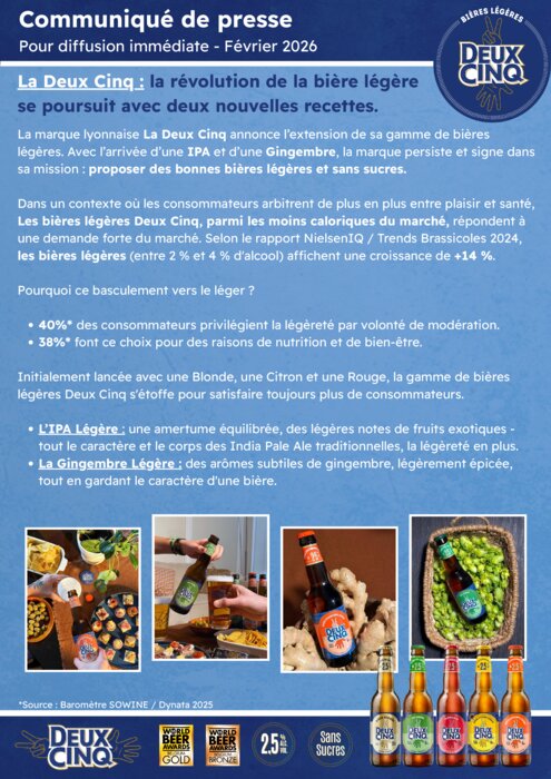 La marque lyonnaise La Deux Cinq annonce l’extension de sa gamme de bières légères. Avec l’arrivée d’une IPA et d’une Gingembre, la marque persiste et signe dans sa mission : proposer des bonnes bières légères et sans sucres.