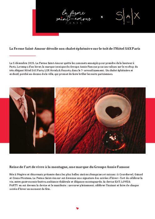 Le 5 décembre, La Ferme Saint-Amour quitte les sommets enneigés pour prendre de la hauteur à Paris. Le temps d’un hiver, la marque iconique du Groupe Annie Famose pose ses valises sur le rooftop du très élégant Hôtel SAX Paris, LXR Hotels & Resorts, dans le 7e arrondissement. Un chalet éphémère et exclusif, perché au-dessus de la ville, qui promet de faire briller les nuits parisiennes.