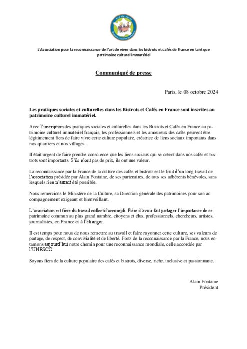 Avec l’inscription des pratiques sociales et culturelles dans les Bistrots et Cafés en France au patrimoine culturel immatériel français, les professionnels et les amoureux des cafés peuvent être légitimement fiers de faire vivre cette culture populaire, créatrice de liens sociaux importants dans nos quartiers et nos villages.