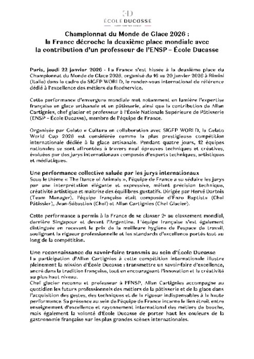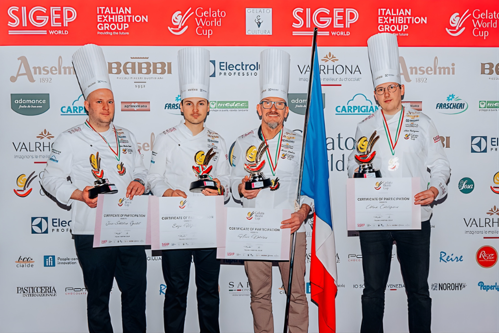 La France s’est hissée à la deuxième place du Championnat du Monde de Glace 2026, organisé du 16 au 20 janvier à Rimini (Italie) dans le cadre de Sigep World, le rendez-vous international de référence dédié à l’excellence des métiers du foodservice. Sous le thème « The Dance of Animals », l’équipe de France a su séduire les jurys par une interprétation élégante et expressive, mêlant précision technique, créativité artistique et maîtrise des équilibres gustatifs. Dirigée par Hervé Dartois en qualité de Team Manager, l’équipe française était notamment composée d'Allan Cartignies chef glacier et chef Formateur à l'Ecole Nationale Supérieure de Pâtisserie à Yssingeaux.