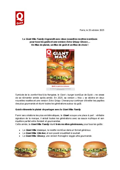 Symbole de la comfort food à la française, le Giant- burger iconiQue de Quick-ne cesse de se réinventer année après année. En 2025, sa version « Max » se décline en deux nouvelles recettes et une version Extra Qrispy Cheese pour continuer d’éveiller les papilles des plus gourmands et réunir toutes les générations autour du goût.