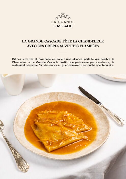 Restauration commerciale 23 janvier 2026 - 11:11 Crêpes suzettes et flambage en salle : une alliance parfaite qui célèbre la Chandeleur à La Grande Cascade. Institution parisienne par excellence, le restaurant perpétue l’art du service au guéridon avec une touche spectaculaire. PDF (304 Ko) Télécharger
