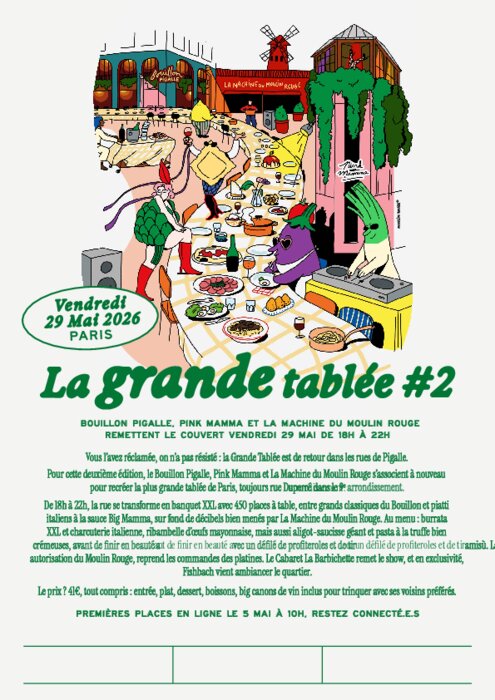 La Grande Tablée fait son retour à Pigalle vendredi 29 mai, de 18h à 22h. Bouillon Pigalle, Pink Mamma et La Machine du Moulin Rouge transforment à nouveau la rue Duperré en banquet xxl à ciel ouvert, réunissant 450 convives autour d’un dîner festif mêlant classiques du bouillon, spécialités italiennes et programmation musicale.