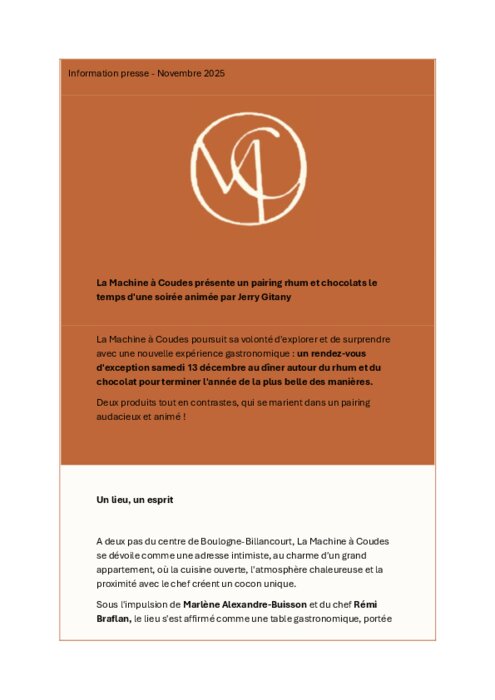 La Machine à Coudes poursuit sa volonté d'explorer et de surprendre avec une nouvelle expérience gastronomique : un rendez-vous d'exception samedi 13 décembre au dîner autour du rhum et du chocolat pour terminer l'année de la plus belle des manières.