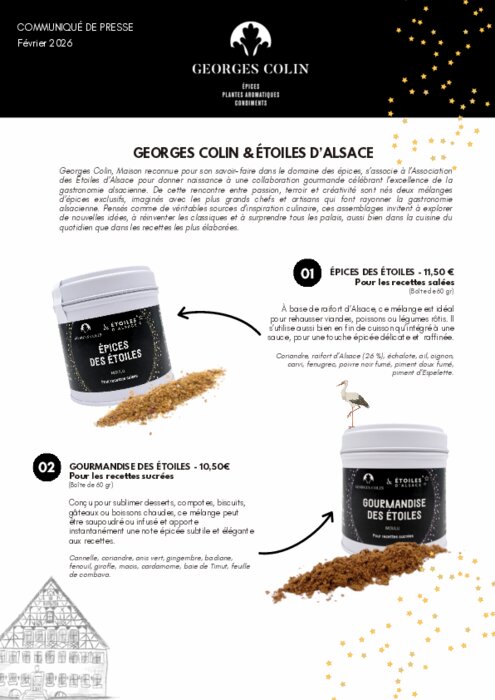 Georges Colin, Maison reconnue pour son savoir-faire dans le domaine des épices, s’associe à l’Association des Étoiles d’Alsace pour donner naissance à une collaboration gourmande célébrant l’excellence de la gastronomie alsacienne. De cette rencontre entre passion, terroir et créativité sont nés deux mélanges d’épices exclusifs, imaginés avec les plus grands chefs et artisans qui font rayonner la gastronomie alsacienne. Pensés comme de véritables sources d’inspiration culinaire, ces assemblages invitent à explorer de nouvelles idées, à réinventer les classiques et à surprendre tous les palais, aussi bien dans la cuisine du quotidien que dans les recettes les plus élaborées.
