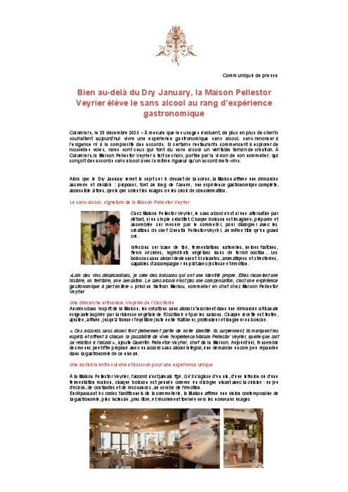 À mesure que les usages évoluent, de plus en plus de clients souhaitent aujourd’hui vivre une expérience gastronomique sans alcool, sans renoncer à l’exigence ni à la complexité des accords. Si certains restaurants commencent à explorer de nouvelles voies, rares sont ceux qui font du sans alcool un véritable terrain de création. À Colomiers, la Maison Pellestor Veyrier a fait ce choix, portée par la vision de son sommelier, qui conçoit des accords sans alcool avec la même rigueur qu’un accord mets-vins.