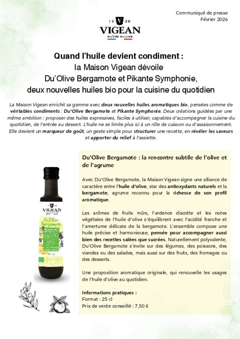 Fournisseurs 11 février 2026 - 10:35 La maison Vigean présente deux nouvelles huiles bio : Du’Olive Bergamote, une huile d'olive infusée avec la star des agrumes et une revisite très parfumée de la fameuse huile piquante avec Pikante Symphonie. PDF (844 Ko) Télécharger